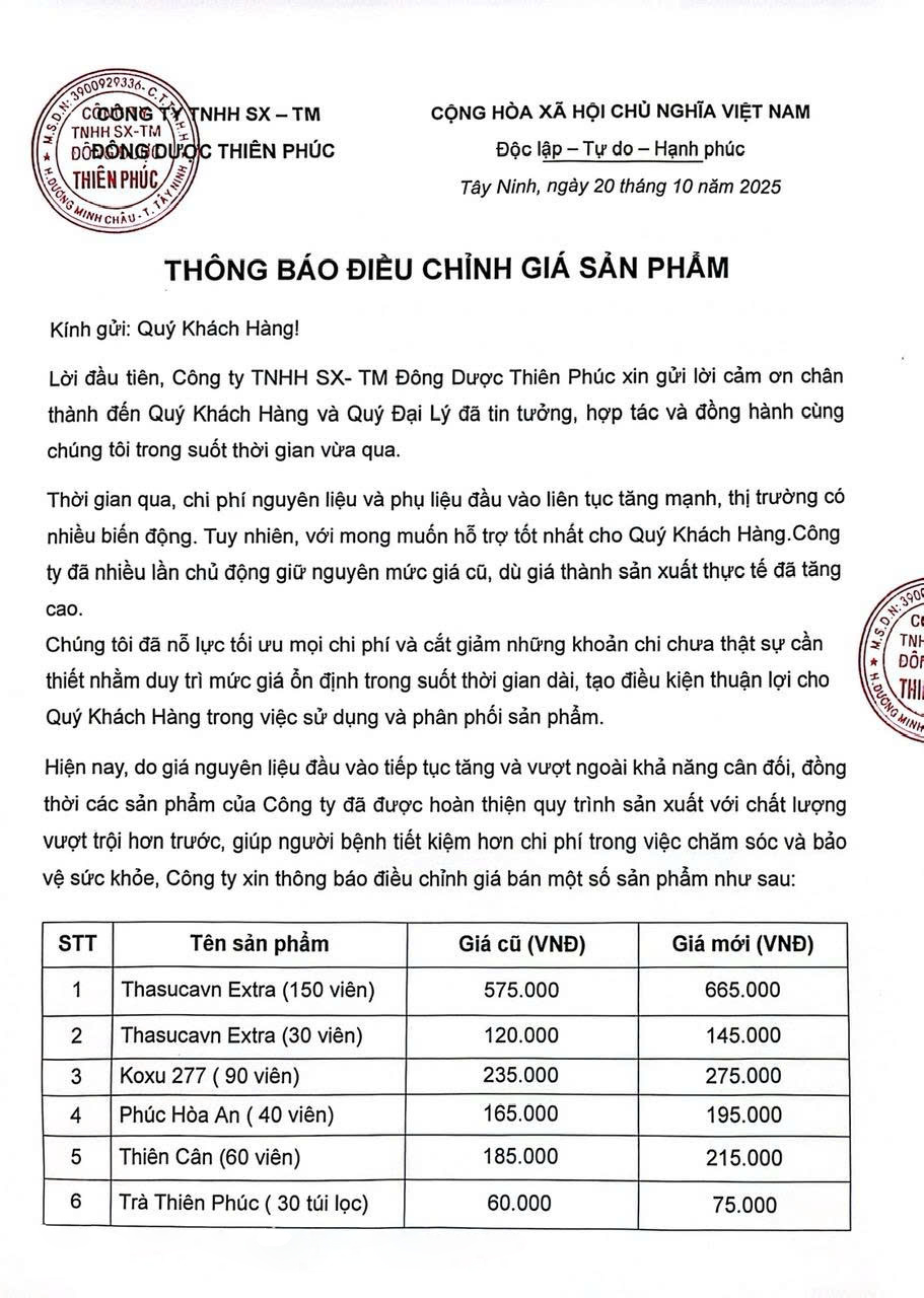 Đông Dược Thiên Phúc thông báo điều chỉnh giá sản phẩm từ 1/11/2025