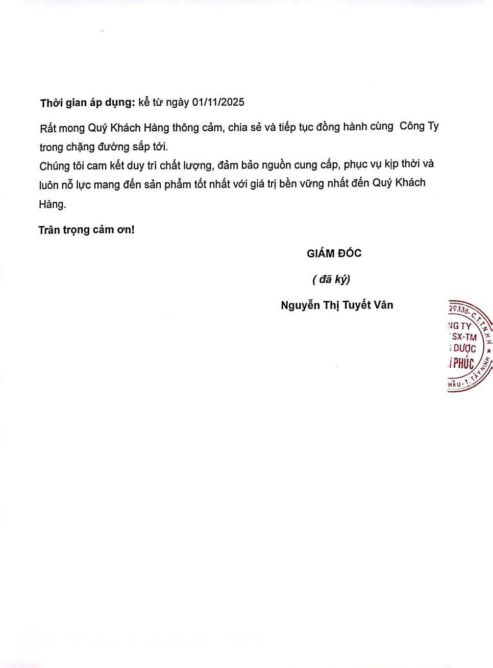 Kể từ ngày 01/11/2025, Công ty TNHH SX – TM Đông Dược Thiên Phúc chính thức điều chỉnh giá bán một số sản phẩm, bao gồm: