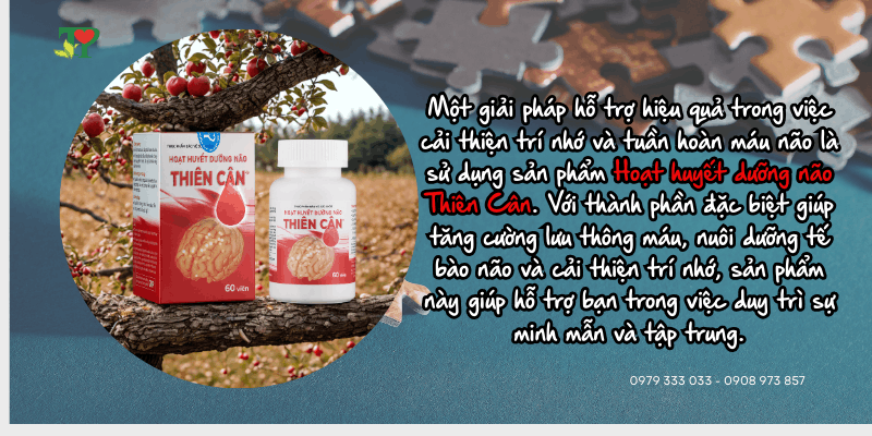 Một giải pháp hỗ trợ hiệu quả trong việc cải thiện trí nhớ và tuần hoàn máu não là sử dụng sản phẩm Hoạt huyết dưỡng não Thiên Cân. Với thành phần đặc biệt giúp tăng cường lưu thông máu, nuôi dưỡng tế bào não và cải thiện trí nhớ, sản phẩm này giúp hỗ trợ bạn trong việc duy trì sự minh mẫn và tập trung.