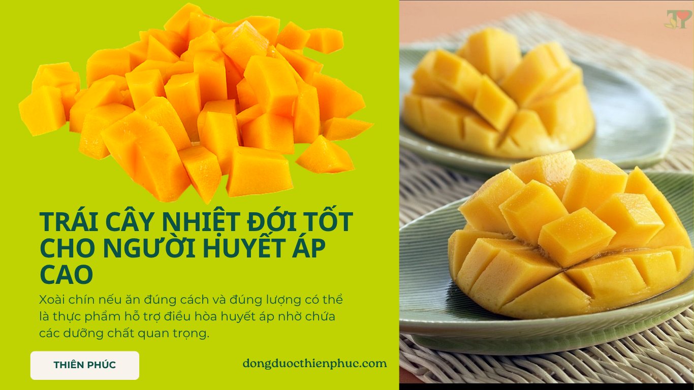 Xoài là loại trái cây nhiệt đới tốt cho người huyết áp cao vì trong xoài có mangiferin . Một polyphenol mạnh mẽ với khả năng chống oxy hóa cao, giúp giãn mạch máu, cải thiện lưu thông huyết. Góp phần làm giảm huyết áp, đặc biệt ở những người mắc hội chứng chuyển hóa. Chất này hoạt động bằng cách ức chế các gốc tự do và điều hòa enzyme ACE . Yếu tố tham gia vào quá trình co mạch và tăng huyết áp. Đây cũng là cơ chế mà một số loại thuốc điều trị tăng huyết áp hiện nay đang sử dụng.